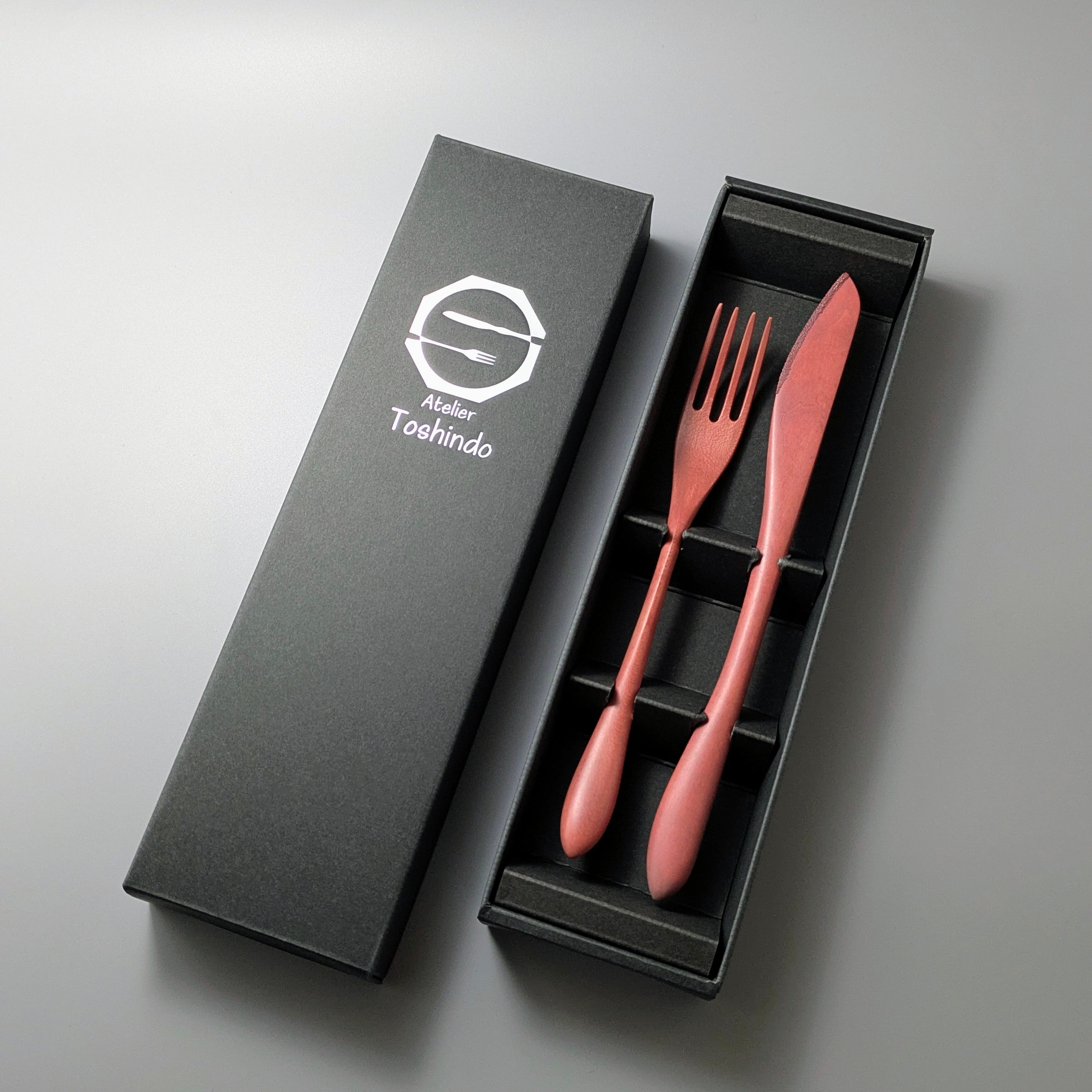 漆で薔薇色に仕上げた、木製のカトラリーセットです。